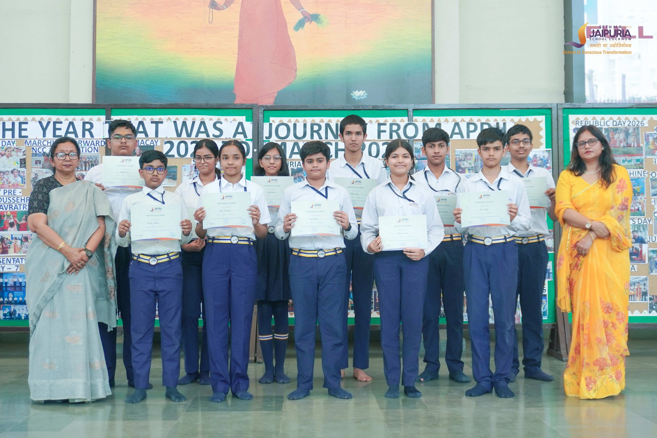These students were felicitated during the assembly, with finalists including Lavanya Shukla, Ayansh Kumar, Anvi Sahai, Nimesh Niranjan and Ishanvi Singh Bohra, while Fareeha Mashhood Khan emerged as the national winner in her category.