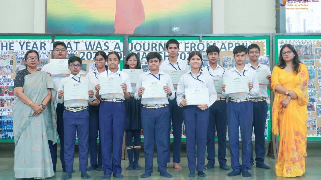 A significant highlight of the assembly was the recognition of the school’s JEE batch, where students were felicitated for their performance in the JEE Mains examination, with a majority scoring above the 92 percentile and several achieving above the 99.5 percentile mark.