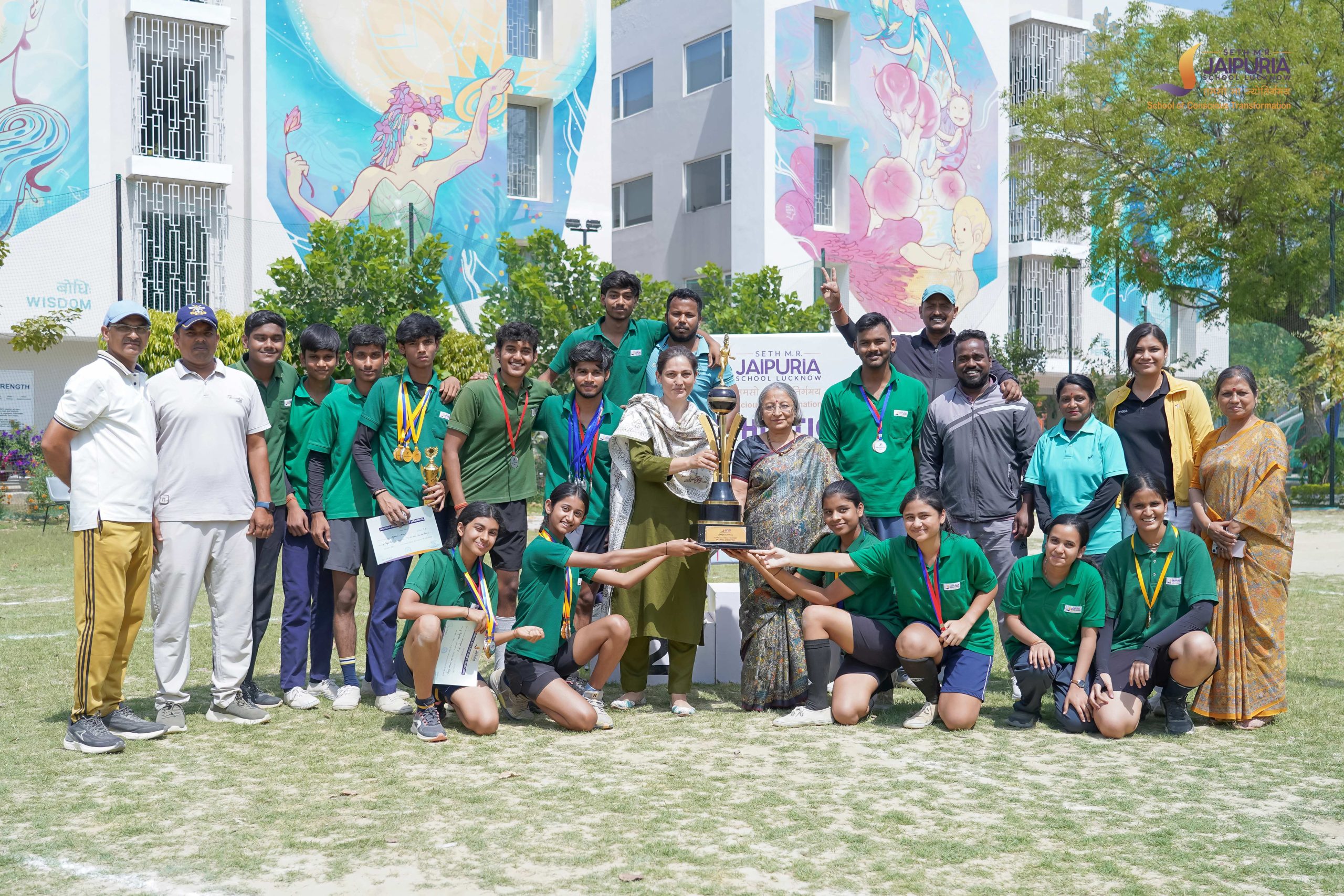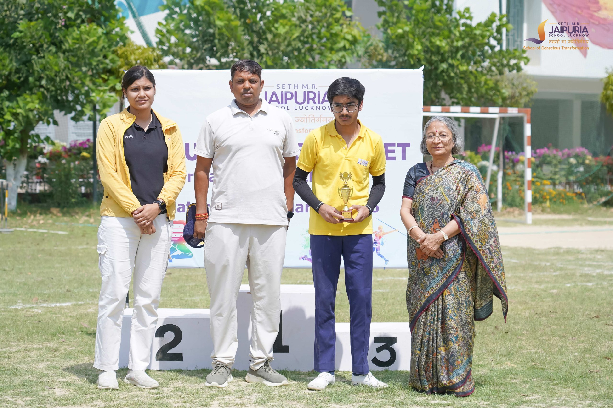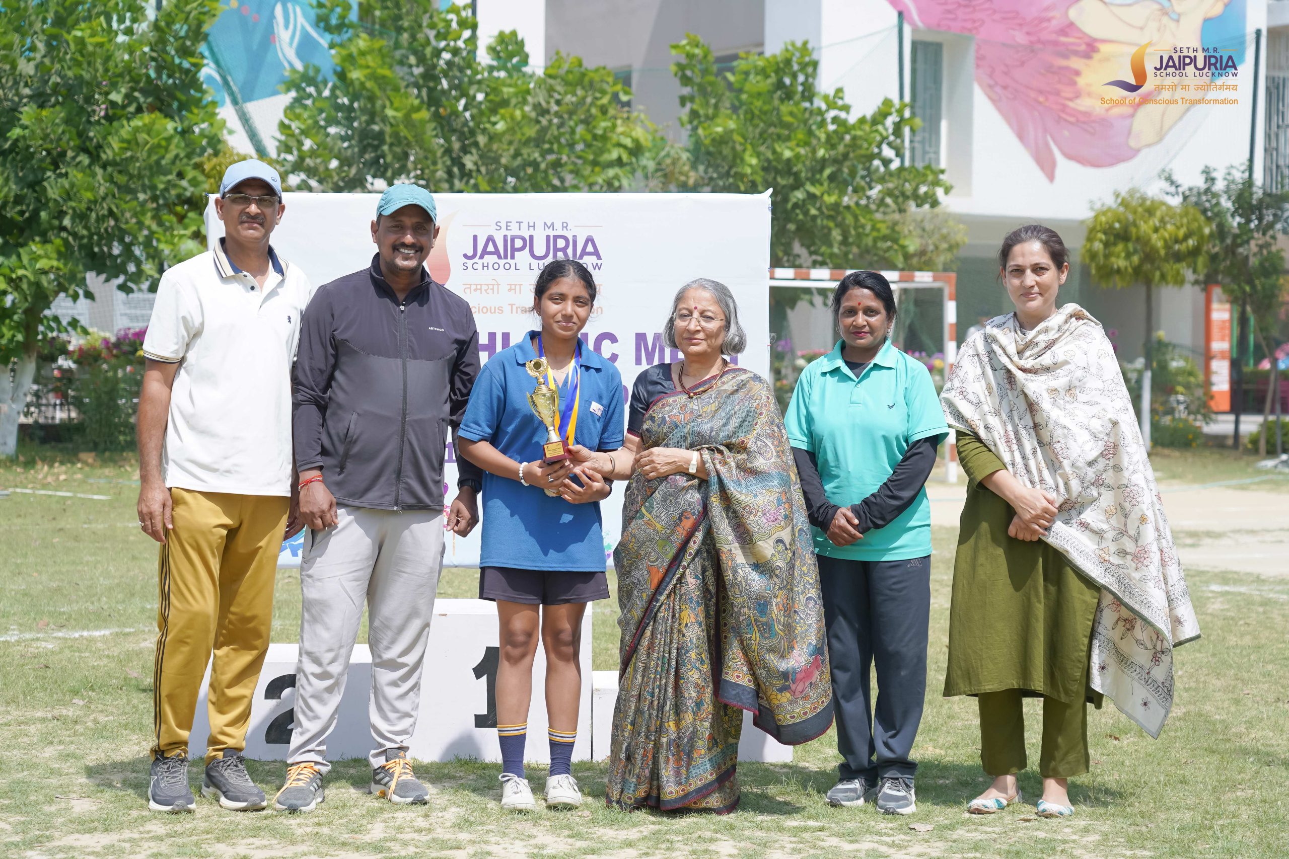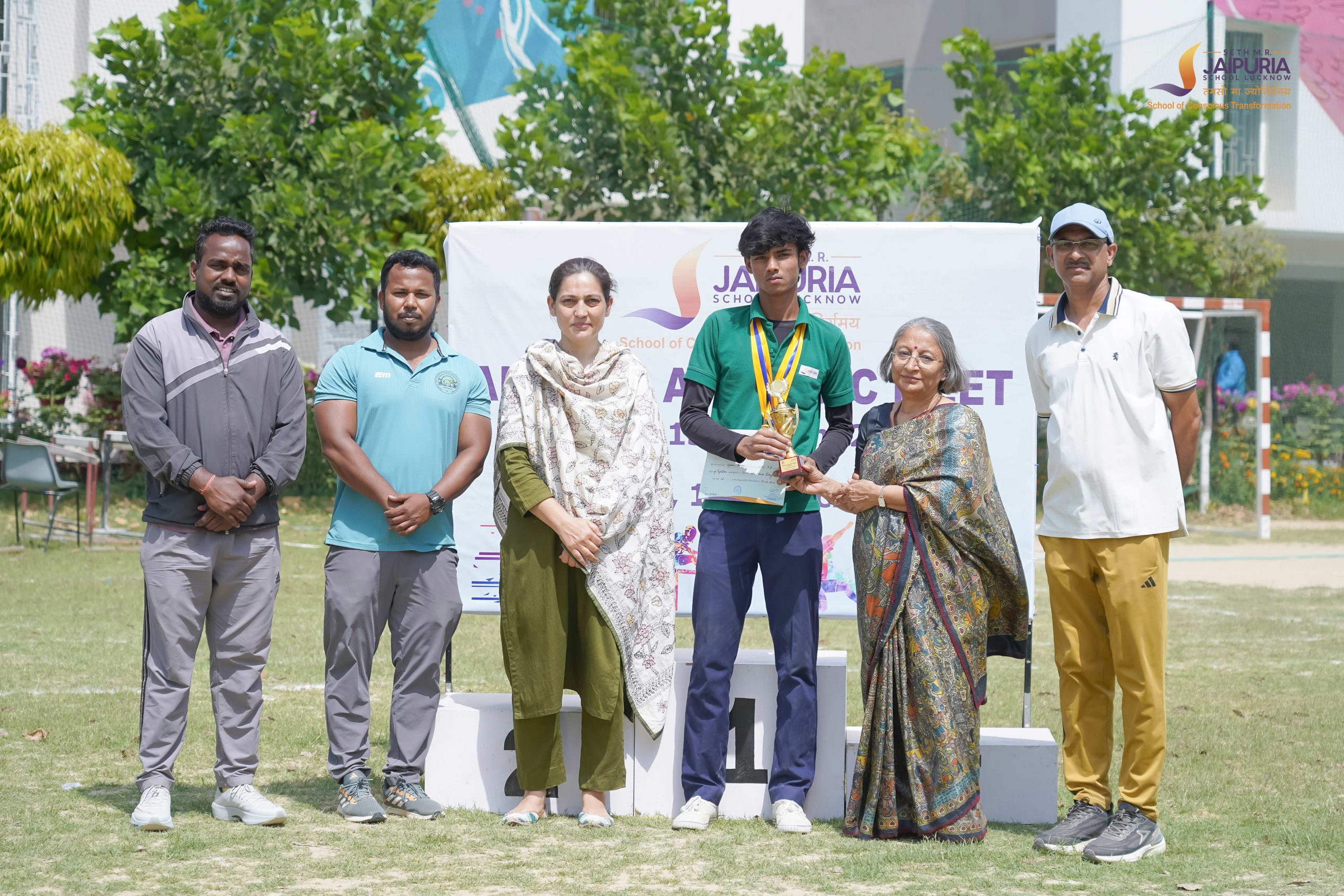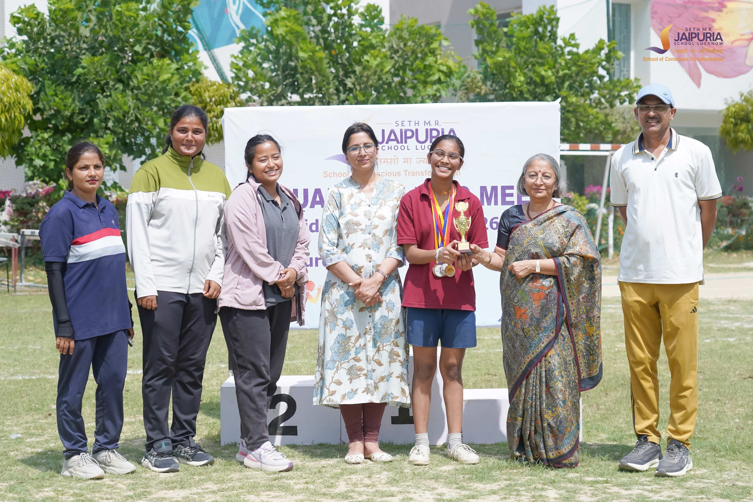The meet concluded with the prize distribution ceremony, where awards were presented by Principal Mrs. Promini Chopra Ma’am along with members of the school leadership team. As the final scores were announced, Perfection House emerged as the overall winner of the meet. In a moment filled with excitement, members of the house ran across the field in celebration, taking a joyful leap as they gathered around the trophy and congratulated one another.