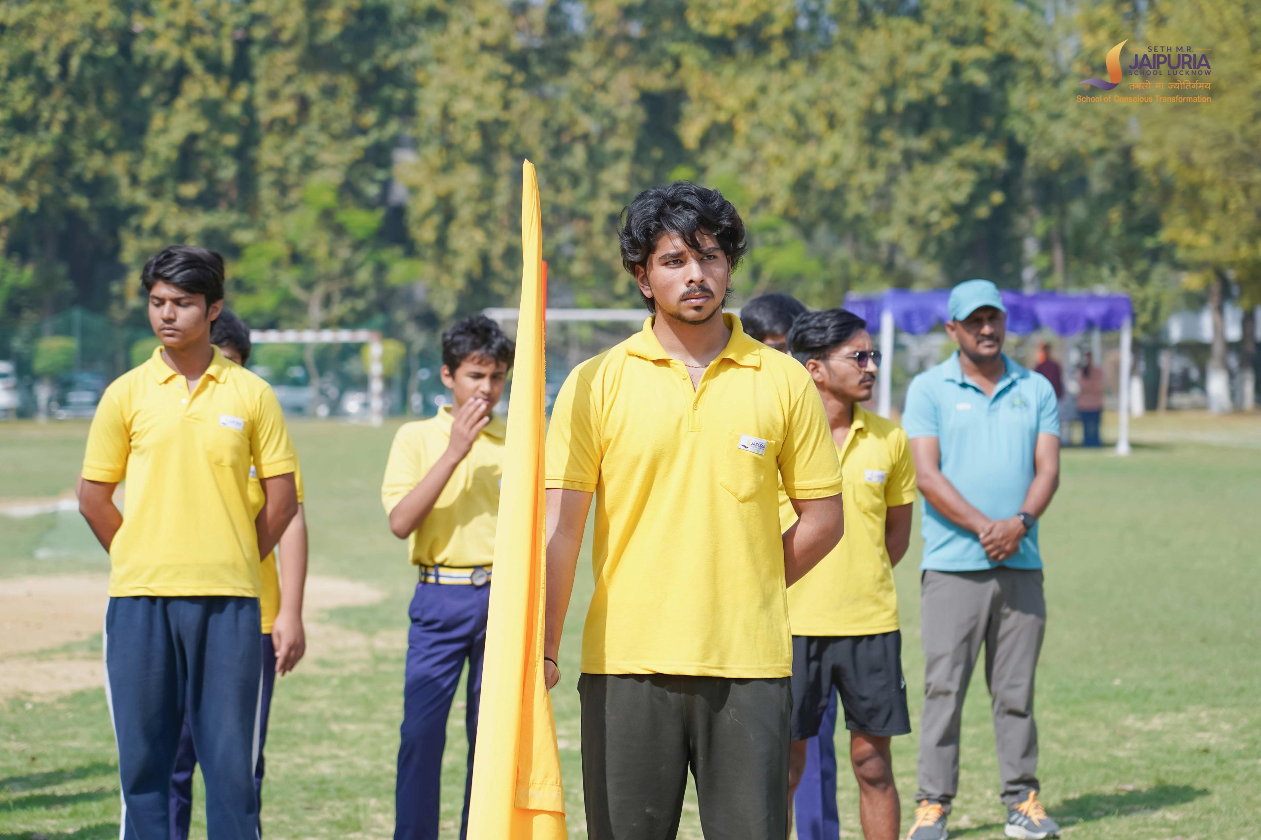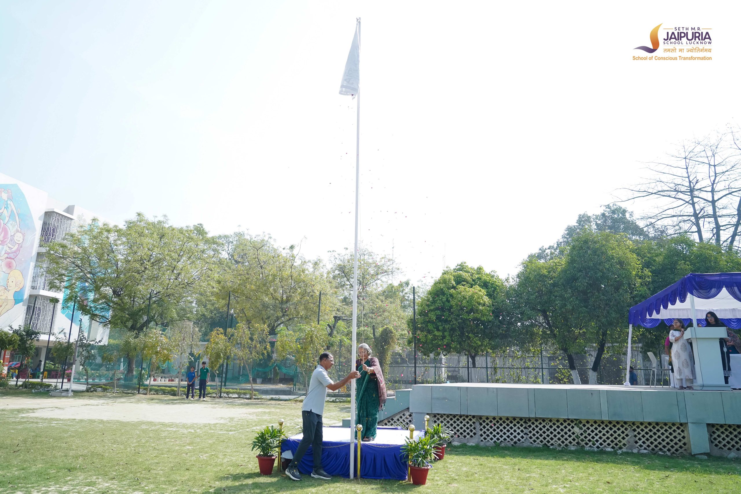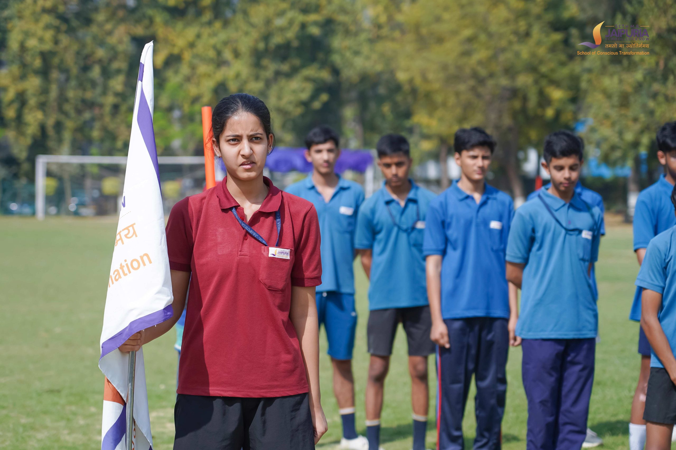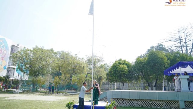 The morning began with students assembling on the ground, followed by the ceremonial flag hoisting. The gathering then joined together to sing the school anthem.